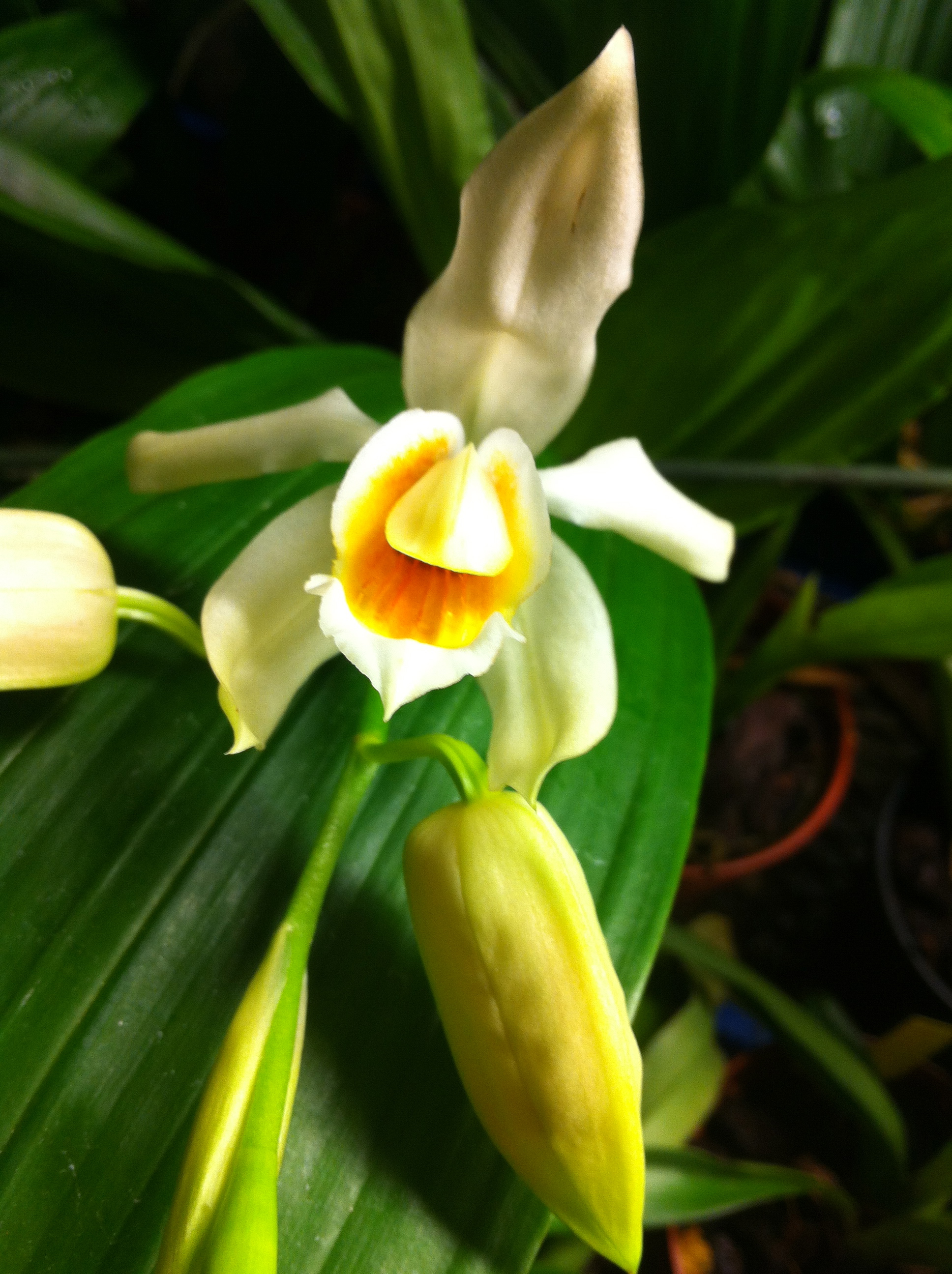 Coelogyne moorena x beccarii, storväxt planta med kraftiga blad, vita blommor m lite orange, ca 7 cm, flera per stängel, nu med stängel, 280 kr