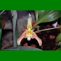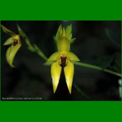 Bulbophyllum carunculatum, gula blommor ca 9 cm flera på en efter hand ganska lång stängel, nu med stängel