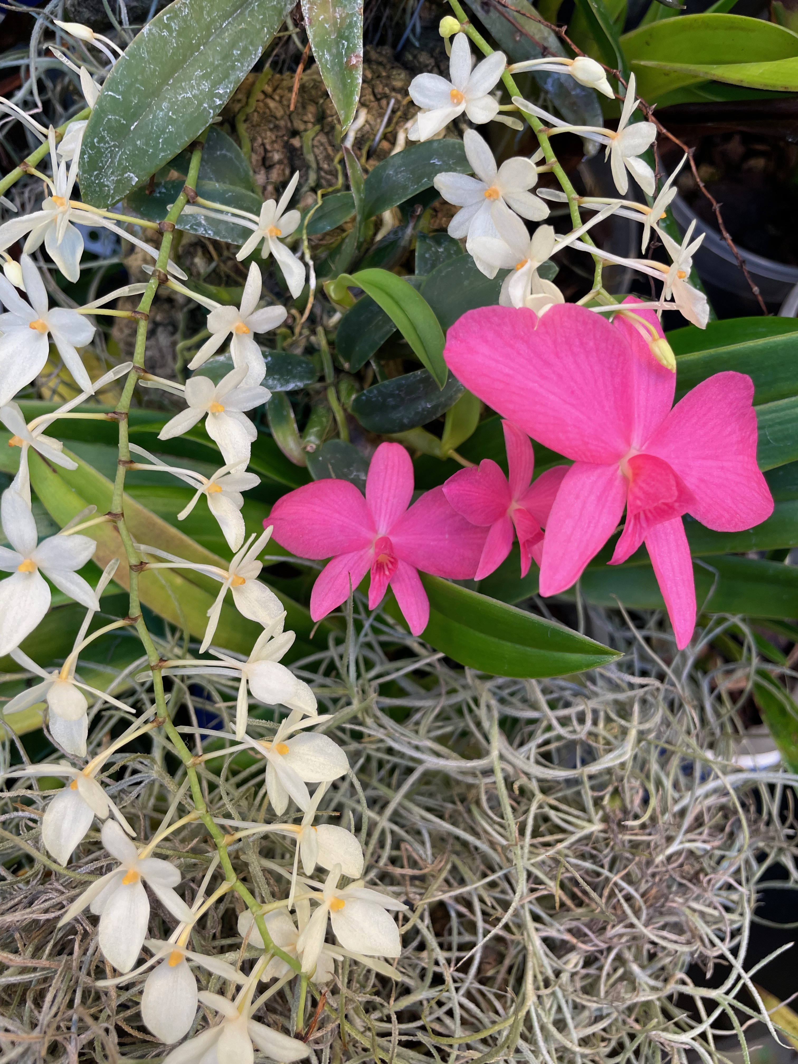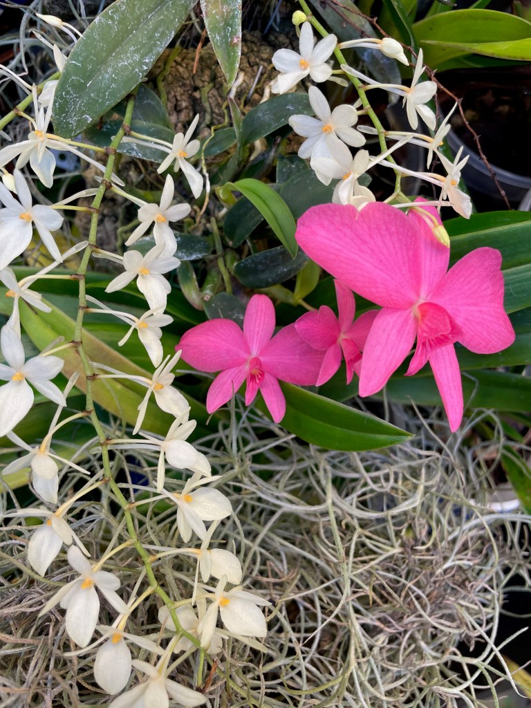 Här en blid på två favoriter i mitt växthus som blommar denna juldag. Det är Aerangis rhodosticta x hyaloides och Sophronitis wittigiana.