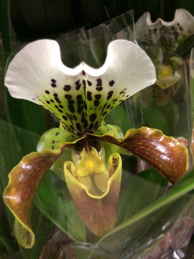 Paphiopedilum, s k amerikansk hybrid, i blom på en stängel, kraftig planta med ett bra skott förutom det blommande, 250 kr Teckningen i blomman kan variera.