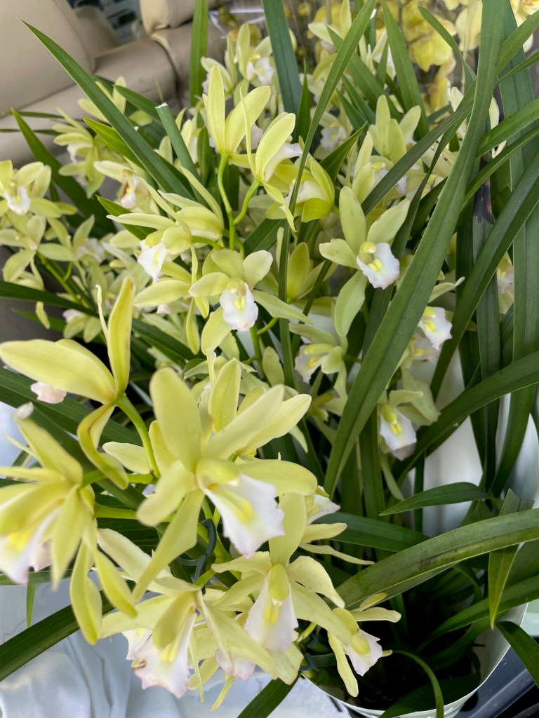 Cymbidium i blom på tre stänglar, en småblommig, 5-6 cm, och småväxt hybrid, ca 40 cm hög, EXTRAPRIS JUST NU 250 kr