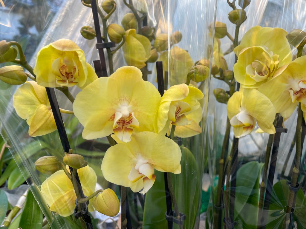 Phalaenopsis Cremona, (namnet ej reg. i RHS) en storblommig, ca 7 cm, intensivt gul hybrid i blom och knopp på fyra stänglar. En riktigt superfin påskplanta! 290 kr