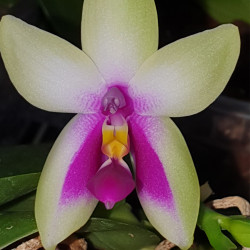 Phalaenopsis bellina, en varmväxande relativt svårodlad art m blankt bladverk, kräver hög RH och ogillar temp under 18 gr. Arten får starkt doftande blommor på mkt kort stängel. Plantor m stängel. 450 kr