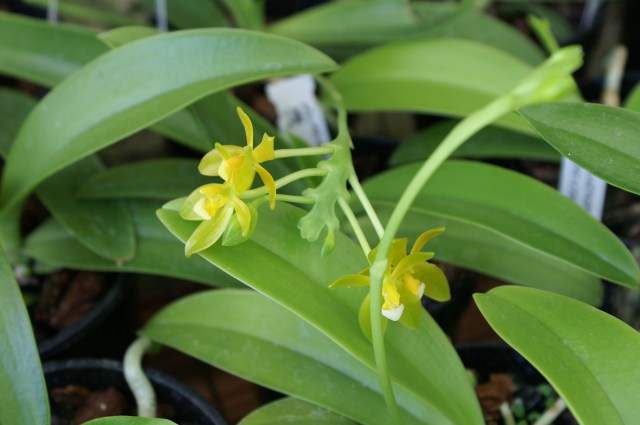 Phalaenopsis cornu cervi flava, en helgul lite ovanlig variant av denna varmväxande art med sina säregna blomställningar, blommor ca 3 cm m svag doft, nu med stängel 420 kr.