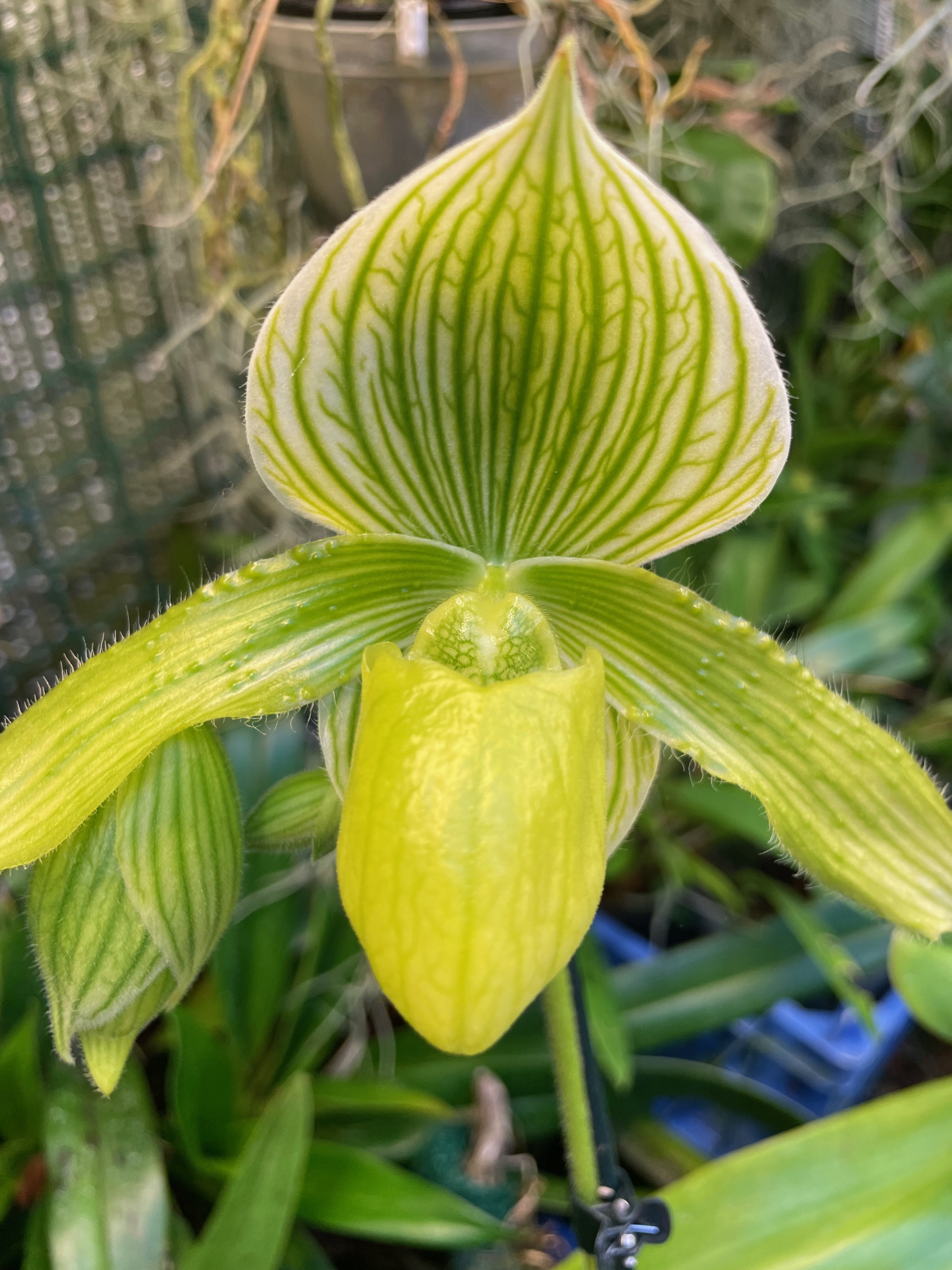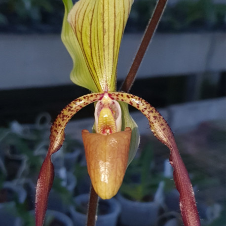 Paphiopedilum haynaldianum x Michael Koopowitz (philippinense x sanderianum), en exklusiv trevägare bestående av tre storväxta, flerblommiga arter. Hybriden får blommor med långa petaler på flerblommig stängel. Blsp ca 30 cm, möjligen blombar, 550 kr