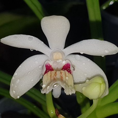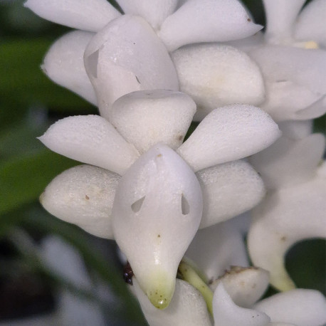 Aerides quinquevulnera v farmeri alba, denna variant saknar de för arten typiska prickarna och kommer från Calayan Island som tillhör Philippinerna. Doftande blommor ca 2 cm, tätt på lätt överhängande stängel. Nu med stängel, 490 kr
