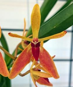 Renanthera vietnamensis x imshootiana, en korsning av två varandra närstående arter, intnensivt röda blommor ca 6 cm, flera på stängeln. Renanthera är nära släkt med Vanda och denna ser ut som en liten vanda och kan blomma som ganska ung. Möjligen blombar, 450 kr