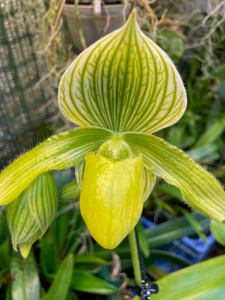 Paphiopedilum Green Horizon, Makuli (Maudiae x sukhakulii) x philippinense album, marmorerart bladverk, flerblommig stängel, blommor ca 12 cm, möjligen blombara plantor, 390 kr