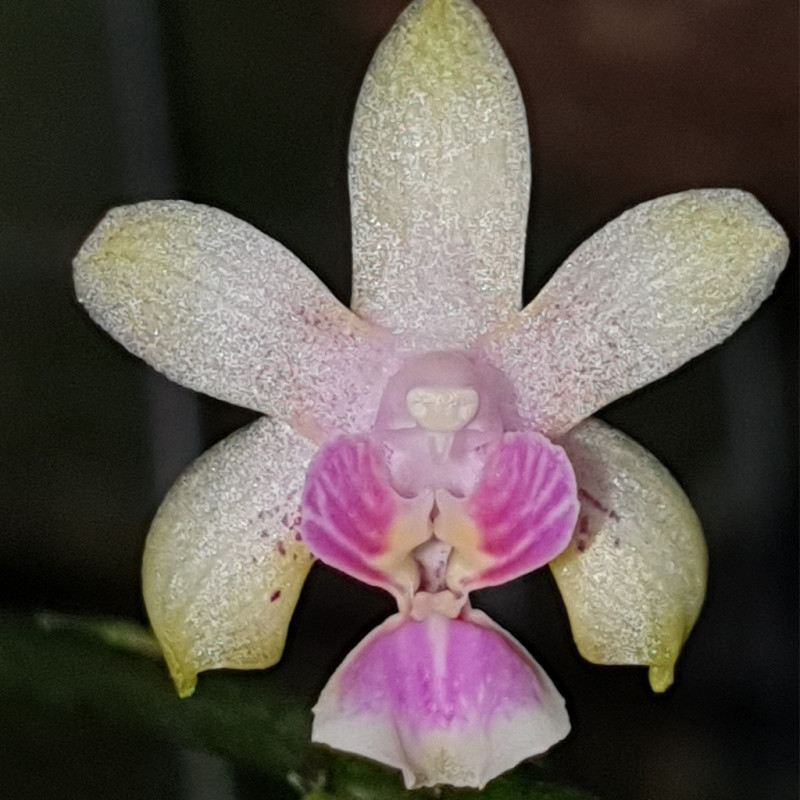 Phalaenopsis deliciosa, tidigare Kingidium, mycket småväxt, varmväxande art som får små blommor, ca 1,5 cm på korta stänglar, arten kan blomma flera ggr om året och lämpar sig bra i skåp, monterad, med stängel, 420