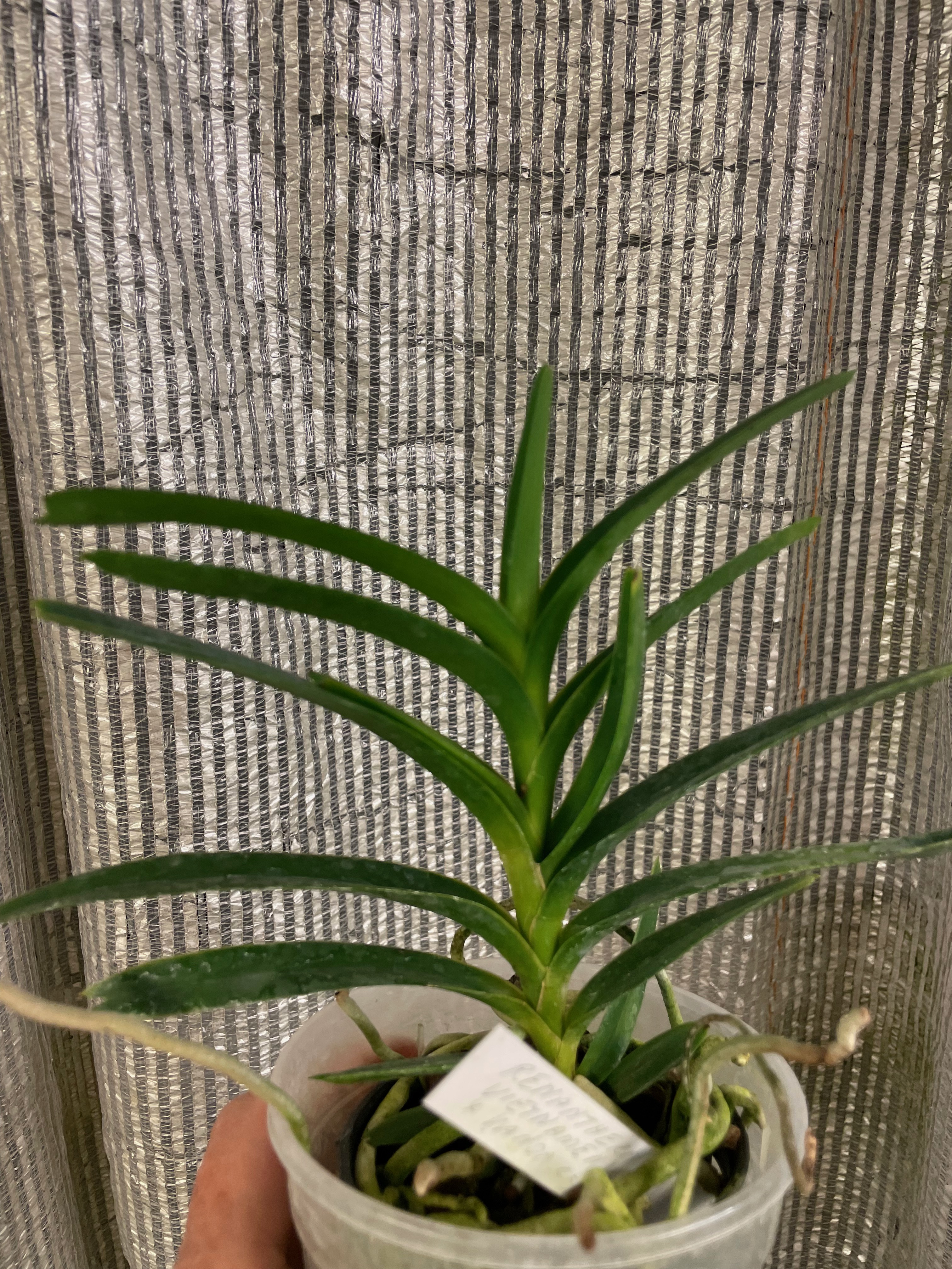 Holcoglossum lingulatum x kimballianum, en primär av två varandra närstående arter med blommor ca 3 cm, flera på stängeln, tereta blad. Arterna är inte så lättodlade, men som vanligt blir hybriden enklare, nu med stängel, 450 kr. Här bild på kimballiana.