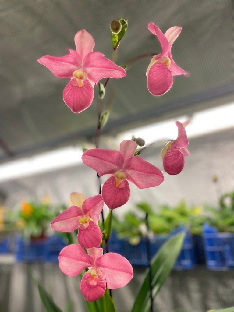 Phragmipedium Mariza Rolando, vilket är kovachii x Hanne Popov som i sin tur består av besseae x schlimii. Hybriden härrör alltså till 50% fr kovachii och är mycket storväxt, nästan en meter hög. Plantan är i nuläget inte flyttbar och jag får därför be om ursäkt för den stökiga bakgrunden.
