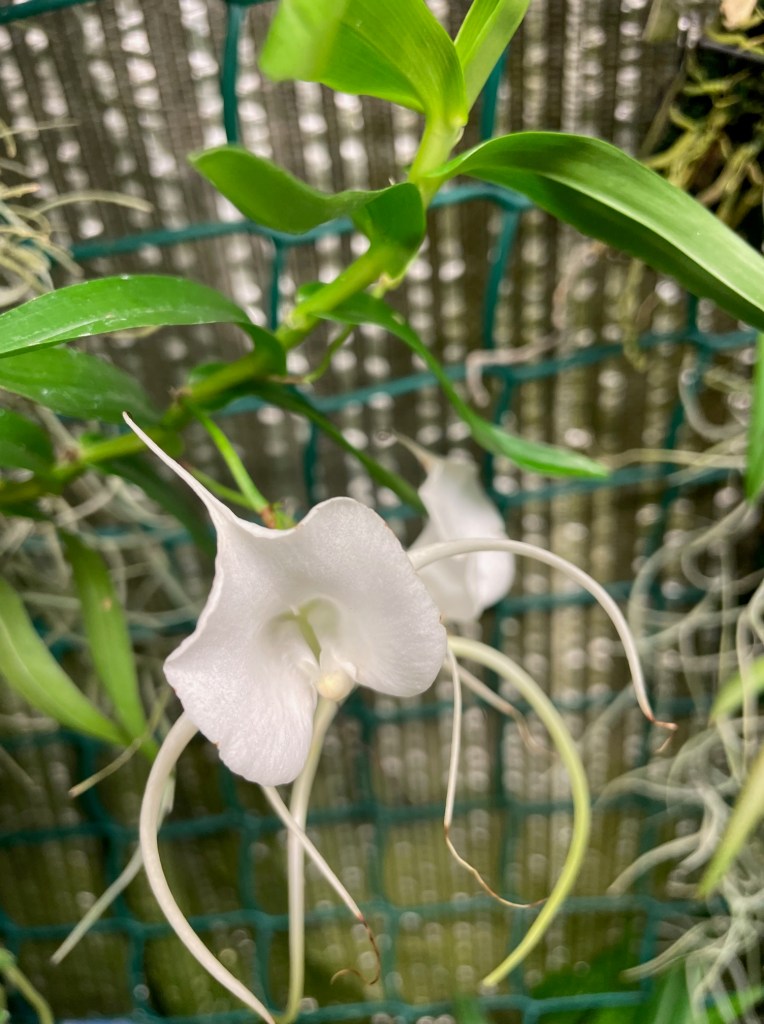 Här är en som vi är mer vana vid att betrakta som en Angraecinae, Angraecum germinyanum som kommer från högre höjder på Madagaskar och vill ha det rätt svalt. Blommorna är hållbara och har en fin doft när det är mörkt.