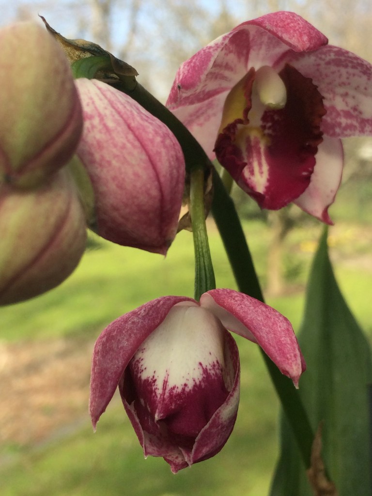 Cymbidium i blom på tre stänglar, en småblommig, 5-6 cm, och småväxt hybrid, ca 40 cm hög, EXTRAPRIS JUST NU 250 kr
