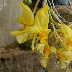 Stanhopea graveolens, en svalväxande art från mellanamerika med starkt doftande blommor på stängel som utvecklas nedåt, vanligen sommarblommande, kraftiga blombara plantor, 450 kr